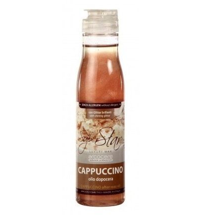 Vysoce kvalitní zklidňující čistící olej po depilaci od italské společnosti Arcocere odstraní zbylý vosk a zabraňuje vysychání pokožky. Arcocere podepilační čistící olej je bohatý na přírodní prvky, má osvěžující a protizánětlivé účinky. Zanechává pokožku jemnou, hladkou a zároveň hydratovanou. Jemná vůně zanechává intenzivní pocit odpočinku. Luxusní olejíček Arcocere obsahuje lesklé glitry, které zanechávají zářivou a třpytivou pokožku. S vůní cappuccino. Objem: 150 ml