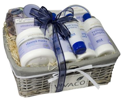 Exkluzivní dárkový koš kosmetiky s kozím mlékem pro péči o pokožku těla i obličeje. Dárek, který potěší každého milovníka přírodní kosmetiky.