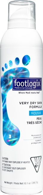 CZ – Pěna vhodná pro velmi suchou pokožku. Hydratuje a obnovuje velmi suchou kůži na nohou. Používá se při pedikúře jako poslední krok před masáží nohou přípravkem Footlogix Massage Fomula. Doporučuje se jako denní péče o nohy pro všechny typy pleti včetně diabetiků. přípravek určený hydrataci a zklidnění velmi suché pokožky. Bez okluze. Pěna se okamžitě vstřebává a nezanechává mastný film. Ponožky a boty mohou být nazuty ihned po aplikaci pěny. „Jednoduše naneste a můžete jít!“Bez parfemace, syntetických olejů a alkoholu. Pokyny k použití: Udržujte ve vzpřímené poloze. Před každým použitím dobře protřepte. Používejte střídmě: Pěnu o velikosti lískového oříšku jemně vetřete do pokožky chodidel. Pro dosažení nejlepších výsledků aplikujte 2x denně: ráno a večer. Upozornění: Obsah pod tlakem. Neumísťujte v blízkosti horké vody nebo radiátorů, sporáků či jiných zdrojů tepla. Nepropichujte ani nevhazujte obal do ohně. Neskladujte při teplotách nad 50°C. Nepoužívejte u otevřeného ohně nebo jiskření. Uchovávejte mimo dosah dětí. Jen pro vnější použití.