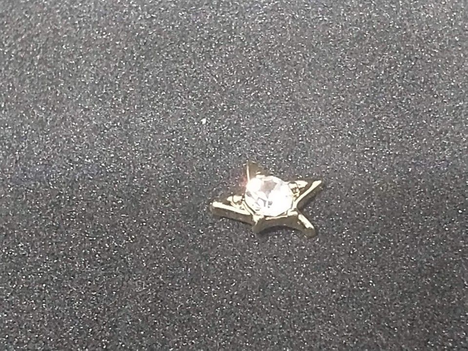 Kovová hvězda ze žlutého kovu s bílým kamínkem.Hvězda má různě dlouhé cípy.