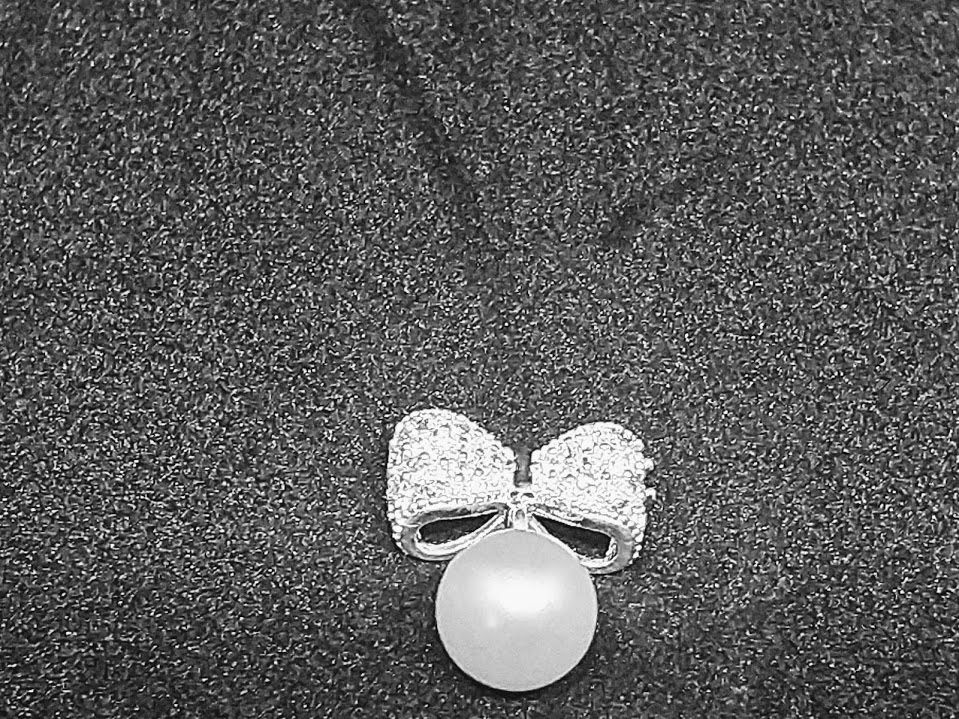 Zdobená mašlička bílými kamínky s visací bílou perličkou.