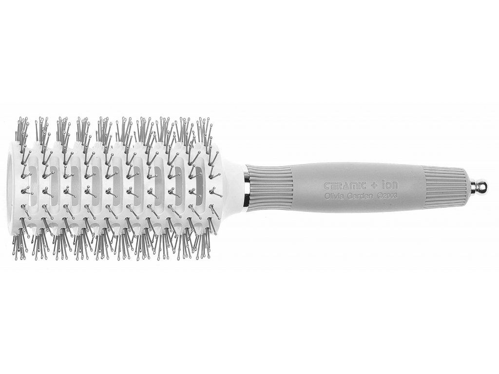Foukací profesionální kartáče na vlasy, plastové ostny šedé barvy zakončené stříbrnou kuličkou, velmi kvalitní a precizní provedení, technologie ceramic + ion, antistatické, vyrobené z keramiky, v ergonomicky tvarované rukojeti vsazen výsuvný hrot na vypichování pramenů vlasů.