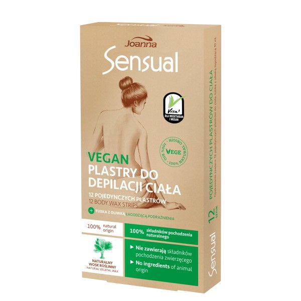 Depilační náplasti Sensual jsou volbou milionů žen. Nové veganské složení náplastí neobsahuje látky živočišného původu. Vosková formulace byla založena na přírodním, vysoce účinném karnaubském vosku, extrahovaném z listů palmy copernicia, arganovém oleji a aloe z organických plantáží. Kromě toho byly v zájmu životního prostředí použity biologicky rozložitelné netkané textilie a obalová fólie.